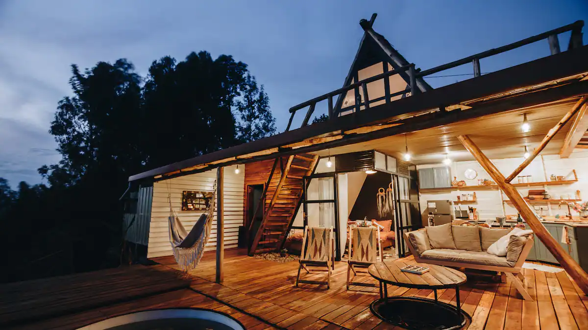 Within the cabin, you’ll find a well-equipped kitchen, sleeping for 4, and a lounge and dining area.